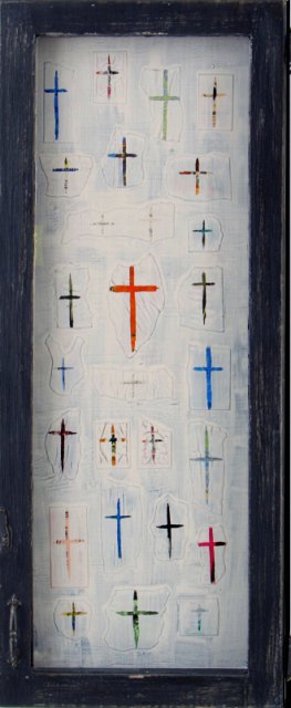 Mixed Media on Wood Window w Glass, Found Objects, Mixed Media on Wood Painting Attached "