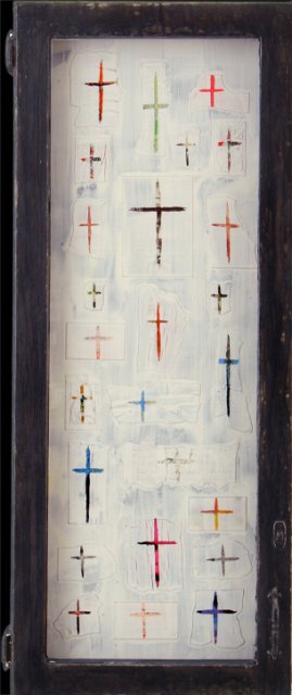 Mixed Media on Wood Window w Glass, Found Objects, Mixed Media on Wood Painting Attached