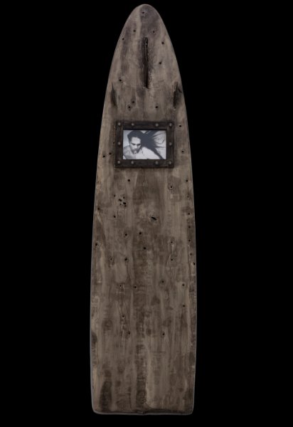 mixed media on bullet riddled fiberglass surfboard, wood, metal bolts photograph,